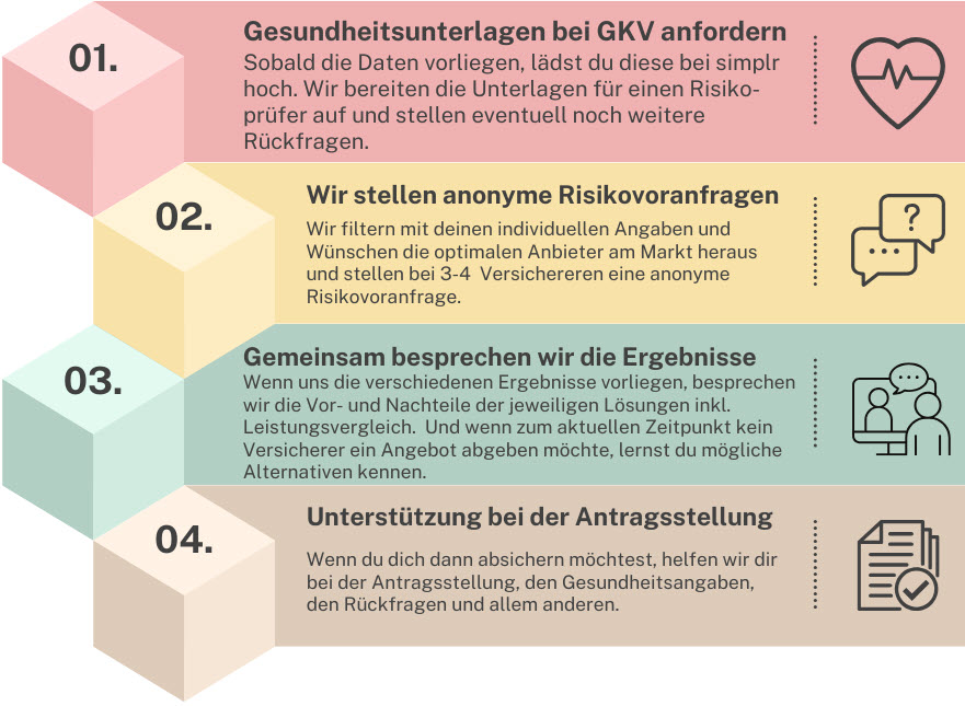 Daher ist es sinnvoll, wenn wir zuerst deine Gesundheitsdaten sauber aufarbeiten Zum Beispiel, indem du eine Übersicht deiner Behandlungsdaten bei deiner GKV anforderst. Wir helfen dir natürlich dabei und wissen auch, wie man diese Daten optimal für den Risikoprüfer vorbereitet und auch wie du am besten mit kritischen Diagnosen umgehst.